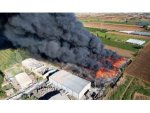GERİ DÖNÜŞÜM FABRİKASINDAKİ YANGINA HAVADAN DA MÜDAHALE BAŞLADI