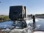 Hatay'da seyir halindeyken alevlere teslim olan tır, yanarak kullanılmaz hale geldi.